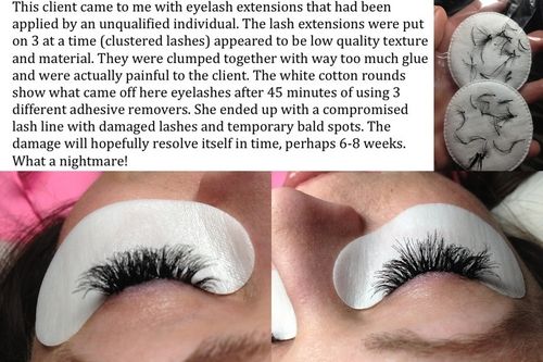 Lash extensions applied improperly can cause damage to your natural lash line. Don't trust your eyes to anyone who doesn't have the proper credentials. Do your research. Remember, what may seem like a bargain at the time, could cost more in the end. Beware of bargain pricing as most reputable salons are around the same price range. Extremely low pricing can reflect stylist inexperience, skill level and inferior product quality.